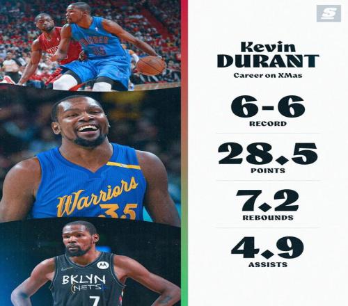 北京時(shí)間明日,一年一度的NBA圣誕大戰(zhàn)即將打響。今日,美媒曬出了火箭球星凱文-杜蘭特的圣誕大戰(zhàn)數(shù)據(jù)。