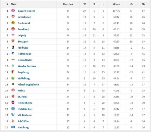 第二名是勒沃庫森,全年取得19勝9平6負(fù)的戰(zhàn)績,第三名是多特,19勝7平8負(fù)。