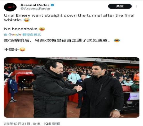 當(dāng)阿爾特塔和助教擊掌相慶后,準(zhǔn)備找到埃梅里握手時(shí),他的西班牙前輩已經(jīng)消失無(wú)蹤。