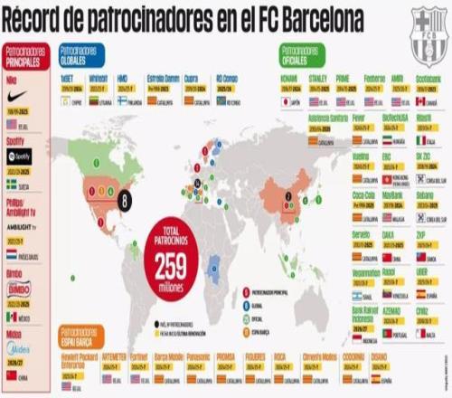 目前,巴塞羅那足球俱樂部在全球范圍內擁有接近50家贊助商,合作伙伴遍布五大洲,展現出在地理分布上持續且均衡的國際化擴張。美洲市場中,合作伙伴包括來自墨西哥的賓堡、加拿大的豐業銀行以及委內瑞拉的拉皮,美國則集中了多達12家不同贊助商,成為俱樂部在該領域的關鍵市場之一。