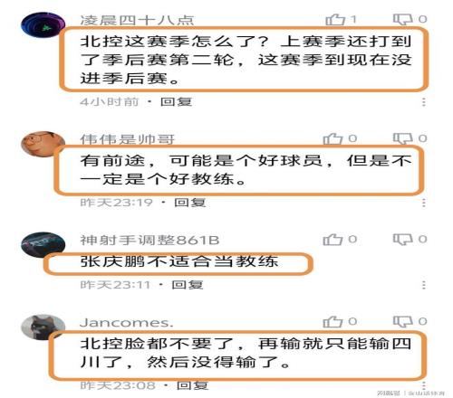 “北控這賽季怎么了?上賽季還打到了季后賽第二輪,這賽季到現在沒進季后賽。”;“有前途,可能是個好球員,但是不一定是個好教練。”;“張慶鵬不適合當教練。”;“北控臉都不要了,再輸就只能輸四川了,然后沒得輸了。”;“張慶鵬在場外明顯心慌了,影響了場上隊員的情緒。”;“在10分鐘的一節里還能丟40分真的神了。”;“北控沒錢找個好點的主教練嗎?”……