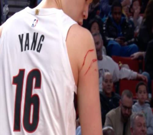 在第四節(jié),楊瀚森拼到個(gè)人5次犯規(guī)下場(chǎng)休息,可以清晰地看到他的肩膀有兩道血印子,還有血在滲出,絕對(duì)是 浴血奮戰(zhàn)。
