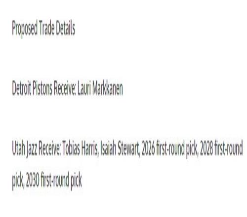 底特律活塞隊本賽季成為東部的大黑馬,戰績領跑東部,引進馬爾卡寧將成為球隊沖擊季后賽乃至總決賽的關鍵一步。潛在的交易方案為:活塞送出托比亞斯·哈里斯、以賽亞·斯圖爾特以及2026年、2028年、2030年三個首輪選秀權,從爵士得到馬爾卡寧。