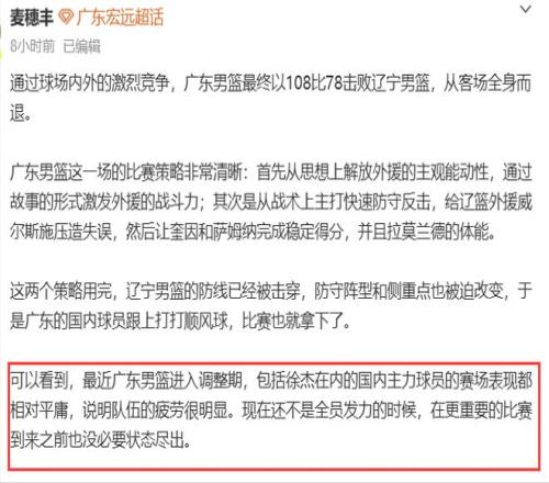 麥記所言非虛,也是相對客觀的說出了廣東隊目前的處境,盡管昨晚廣東輕松大勝了遼寧,但其實球隊現在還沒有達到最佳狀態,徐杰和胡明軒其實都比較疲勞,胡明軒膝蓋有傷一直是邊打邊養,徐杰近期也是換上了流感,身體狀況比較一般,遼粵戰雖然是傳統恩怨局,廣東隊賽前無論是備戰還是從球員采訪中都能看出他們對這場比賽的重視程度,但理性來說,現在并不是廣東隊全員發力的時候,畢竟還有2/3的賽程要打,沒必要在這種時候發揮出全力,把對手打急眼,以免影響了后續的比賽,您覺得呢?